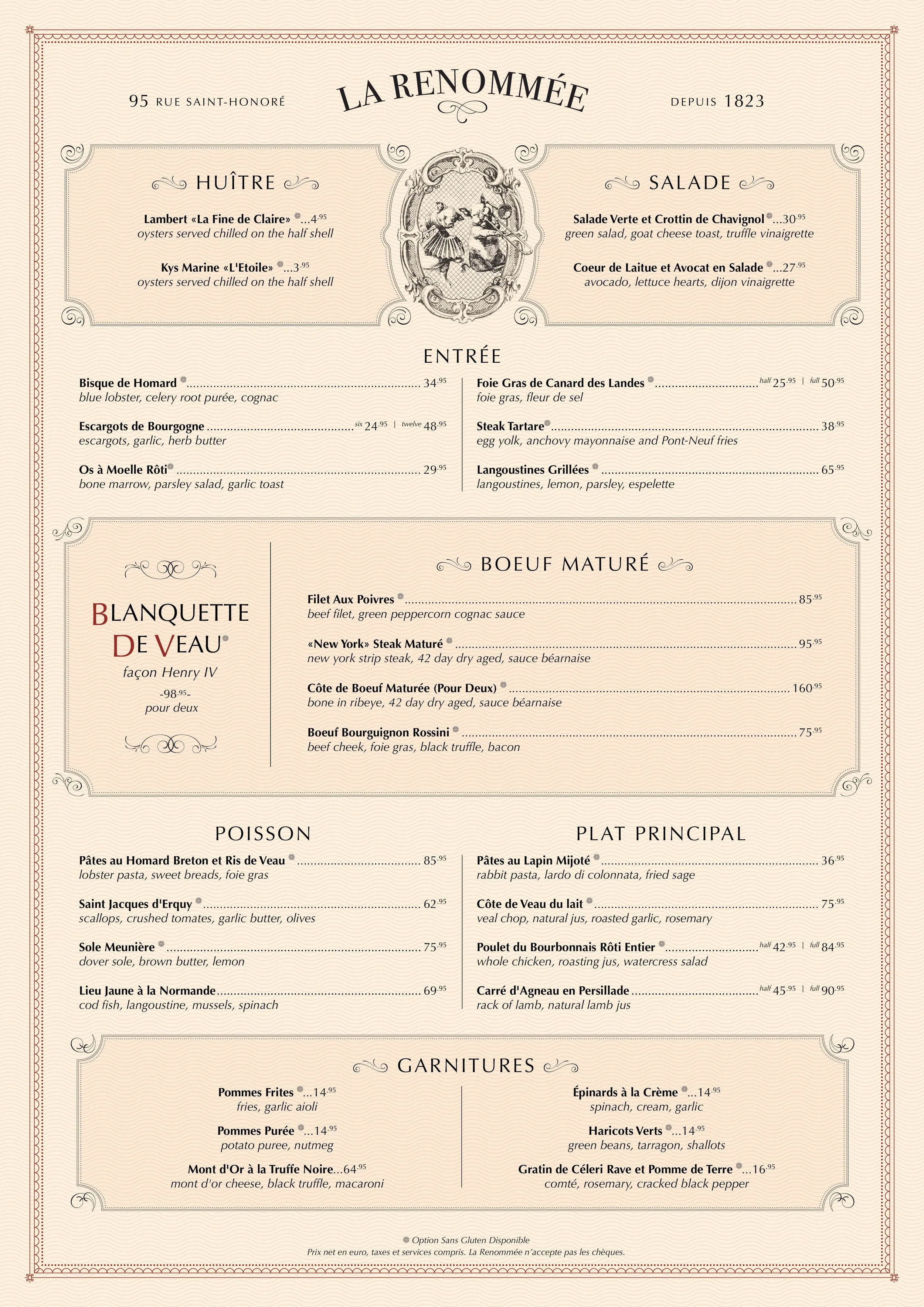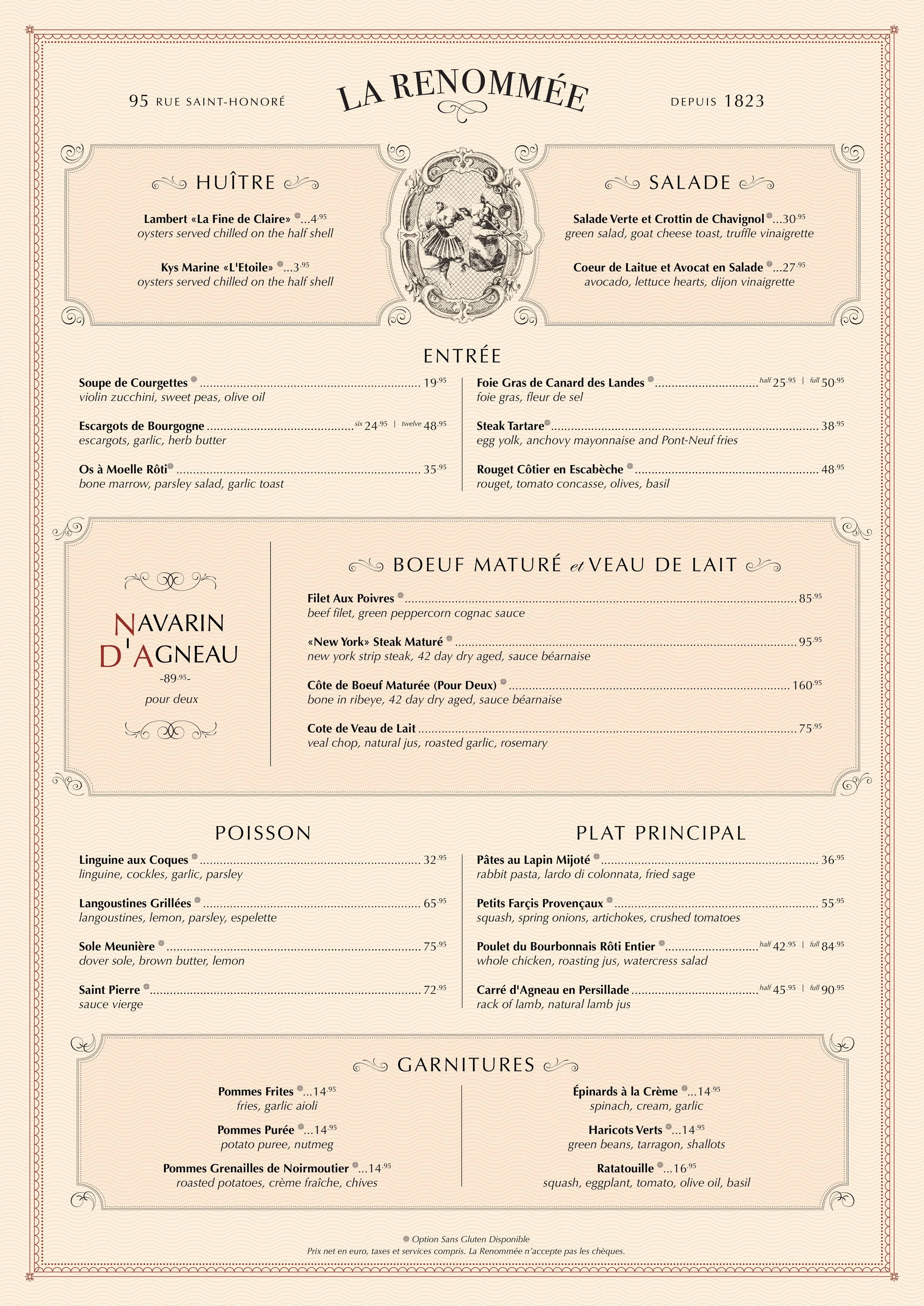 Net prices in euros, taxes and service fees included. La Renommeé does not accept checks.